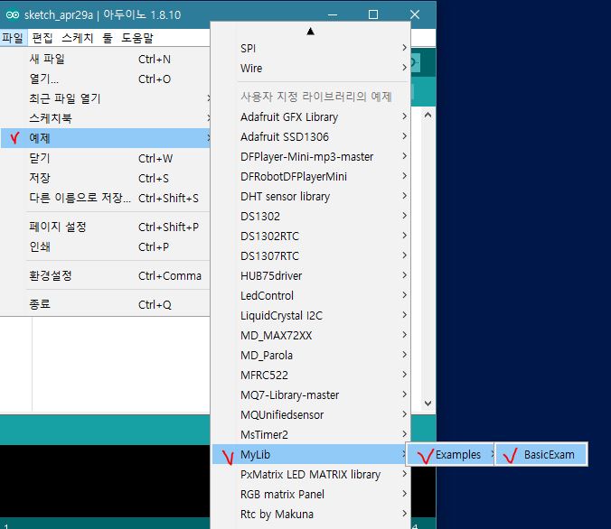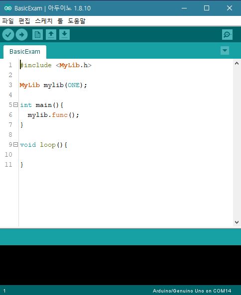 예를 들어 MyLib 라이브러리에 BasicExam.ino 예제 코드를 넣고 싶다면 아래와 같이 구성하면 됩니다.